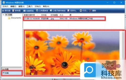 4. 回到“Windows传真和扫描”程序主界面,点击左下角的“扫描”,可以查看扫描内容,其中,右侧上方会显示扫描的文件信息,右侧下方会显示扫描的图片;