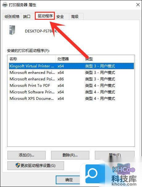 4.在打印服务器属性界面,点击驱动程序;