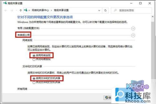 7. 在新页面中选择“共享选项”,打开“来宾或公用”的下拉将“启用网络发现”以及“启用文件和打印机共享”全部勾选;