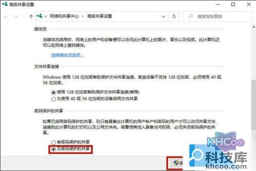 8. 之后打开“所有网络的选项”,勾选“无密码保护的共享”,然后点击“保存更改”;
