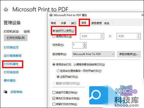 3. 点击【打印机属性】,点击【高级】,将打印机设为【始终可以使用】即可。
