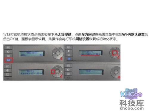 1、点击打印机无线按键,在无线菜单中找到WiFi默认设置后点击OK键将打印机网络初始化。