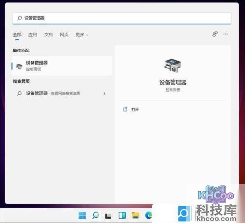 按 Win + S 组合键,或点击任务栏上的搜索。Windows 搜索中,搜索框中输入设备管理器,然后点击打开系统给出的最佳匹配设备管理器控制面板