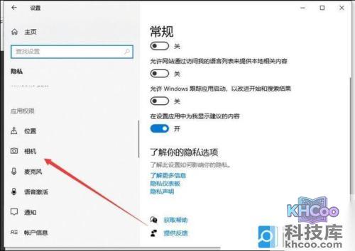 3、隐私主页设置窗口,找到相机,并点击打开;