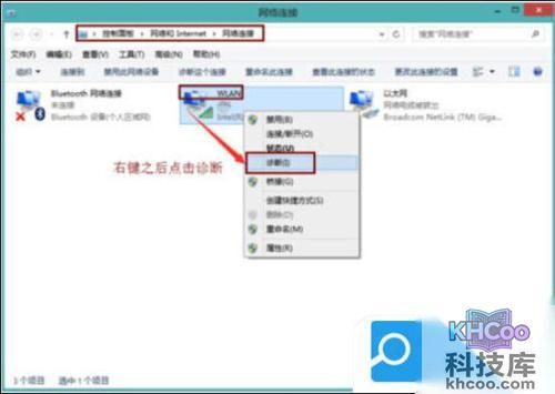 3. 鼠标右键wifi那个连接,再点击里面的诊断。这时电脑会自动诊断连不上wifi的原因并修复连不上wifi的错误。此法一般可修复DHCP错误。