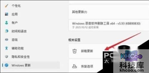 3. 然后点击左边栏“Windows更新”,点开相关设置下的“卸载更新”。