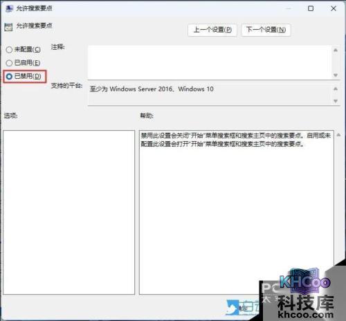 4. 允许搜索要点窗口,选择【 已禁用】;禁用此设置会关闭“开始”菜单搜索框和搜索主页中的搜索要点。启用或未配置此设置会打开“开始”菜单搜索框和搜索主页中的搜索要点。