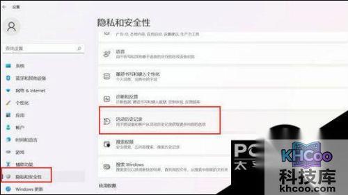 2. 点击左侧的“隐私和安全性”,再点击右侧的“活动历史记录”。