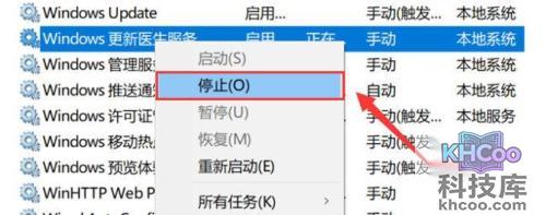 3、右键点击【 Windows更新医生服务 】,然后选择【 停止 】以暂时停止更新服务。