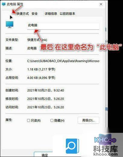 第四步 再次右击资源管理器更改的此电脑图标,将文件类型上方的名称改为此电脑,点击确定