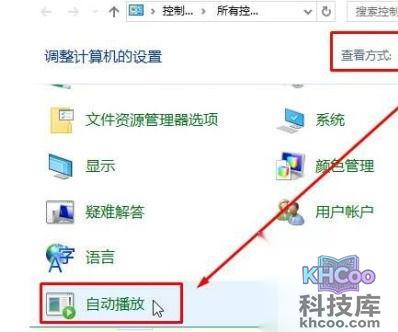 2、点击上面的查看方法选择大图标,然后在点击下面的“自动播放”