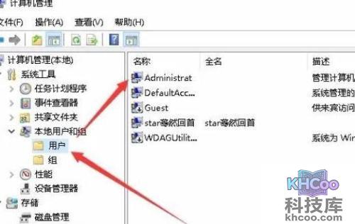 2、接着,在如期展开的计算机管理窗口中,请您依次点击“ 本地用户和组/用户 ”选项,然后在右侧呈现的用户列表中寻找并双击“Administrator”用户名称。