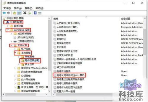 2、依次按序点击左侧菜单栏的" 计算机配置 — Windows设置 — 安全设置 — 本地策略 — 用户权限分配 "。
