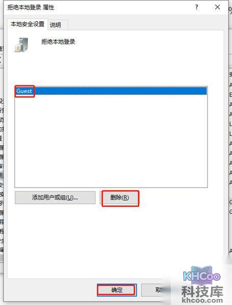 3、选取右侧相对应的选项“ 拒绝从网络访问这台计算机 ”,选定" guest "账户,点击下方的" 删除 "按钮。