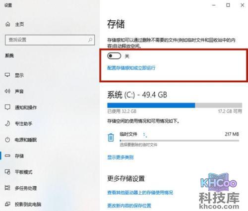 3、将存储开关开启,随后点击进入【配置存储感知或立即运行】。