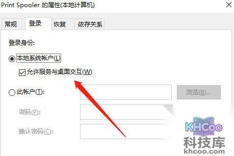 4、点属性,将“登录”选项中的“允许服务与桌面交互”的勾去掉