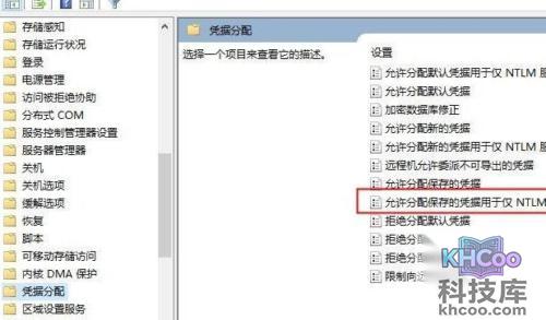 2、在弹出的页面中依次展开“计算机配置”→“管理模版”→“系统”→“凭据分配”→找到“允许分配保存的凭据用于仅NTLM服务器身份验证”项;