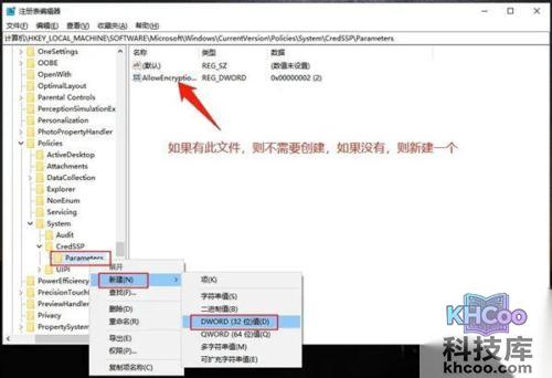 4、进入以后我们右击Parameters,然后我们新建一个DWORD(32)位,将其命名为AllowEncryptionOracle。