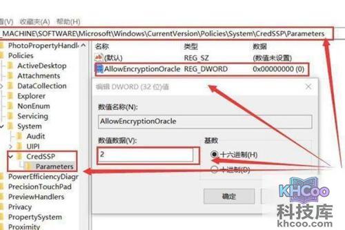 4、点击parameter文件夹,然后右击右侧空白处,选择新建一个DWORD值,我们将其命名为AllowEncryptionOracle,双击打开,在打开的窗口中将数值数据改为2,最后点击确定即可。