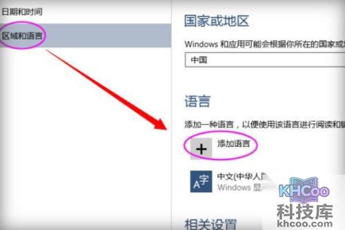 2、在系统设置界面中,点击“ 时间与语言 ”选项,再点击“ 语言和地域 ”选项中的“ 增添语言 ”功能。