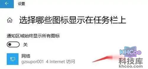4、进入“ 选择哪些图标显示在任务栏上 ”设置界面后,请拉动左侧滚动条至“网络”所在位置,随后将右侧的复选框轻触至左侧,显示为关闭状态。