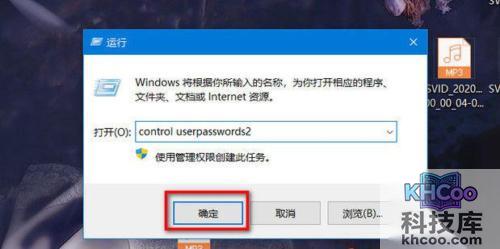 2、在此运行窗口中,输入control userpasswords2命令,然后点击确定(如上图所示)。