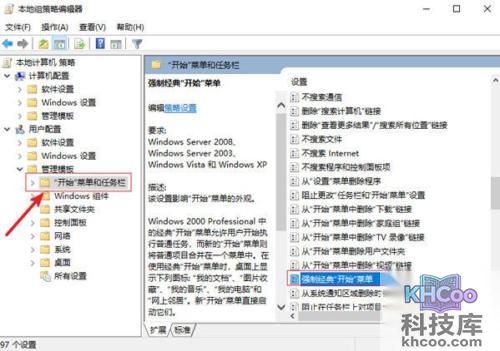 2、随后我们进入策略编辑器页面,然后我们在左边依次点击用户配置,随后我们找到管理模板中找到开始菜单和任务栏,最后在右下方找到强制经典开始菜单。