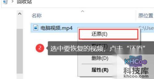 打开电脑的回收站,找到你要恢复的视频,右键点击该视频,选择“还原”,视频就能恢复到原本的位置了。