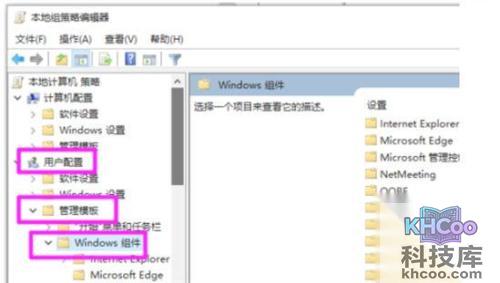 3、随后我们打开本地策略组,然后打开左侧的用户配置,在选择管理模板中的windows组件。