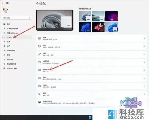 设置窗口,左侧点击个性化,右侧点击触摸键盘(主题、大小)