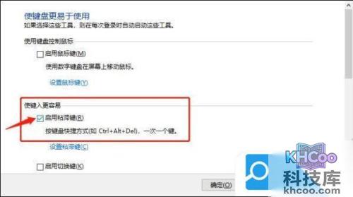 5、 取消勾选“ 启用粘滞键 ”的选项,最后点击确定,就能解锁键盘了。