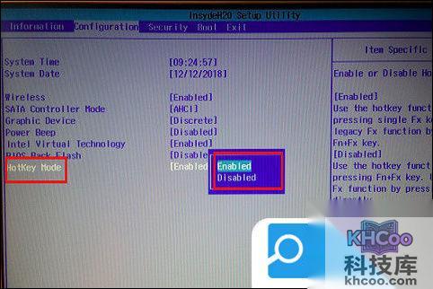 4、还是使用方向键,选择“Hotkey mode”项,按一下“回车键”,把这个选项的状态修改为“Disabled禁用”;