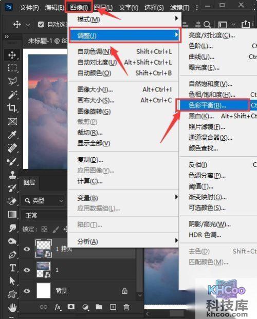 选中拷贝的图片,点击【 图像】-【调整 】找到【 色彩平衡 】。
