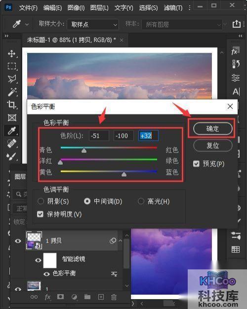 把青色调整为 【-51】,洋红【-100】,蓝色【+32】 ,点击【确定】。