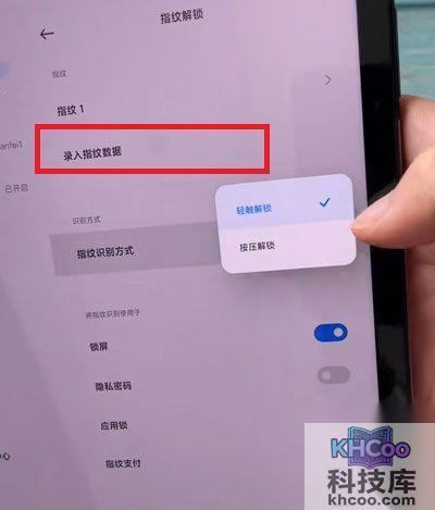 3、在指纹解锁设置界面中,我们可以点击【录入指纹数据】然后录入指纹,在下方的指纹是被方式中可以选择我们常用的指纹解锁方式,可以选择按压和轻触两种指纹解锁方式。