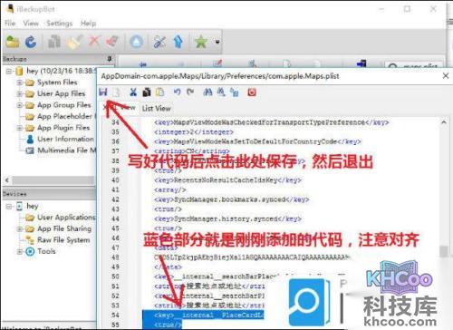 第二步,备份完成后,关闭itunes,软后打开iBackupBot for iTunes,记得关闭itunes,不然有可能会冲突,Hey是我的手机名称,那一栏就是我刚刚备份的数据,单击user app files后,在右上角的搜索框输入com.apple.maps.plist回车
