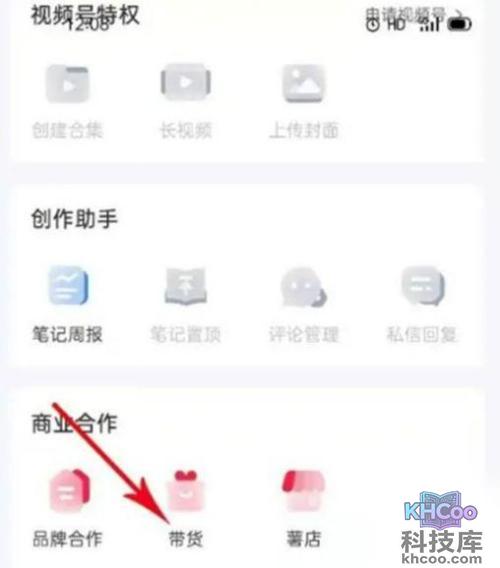 2、在创作中心的页面,找到商业合作,点击带货的选项。