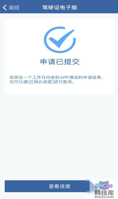 第三步:进入【驾驶证电子版】申领页面后, 系统 自动提示“您当前符合直接使用二代身份证申领电子驾驶证的条件,是否继续申领”,如您选择“申领”,则系统提示“申请已提交”,您将在一个工作日内收到APP推送的申请结果,也可以通过【网办进度】查询当前业务办理进度。