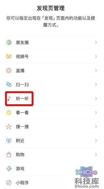 2、然后在微信的发现界面中中,可以看到“听一听”与“扫一扫、摇一摇、看一看、搜一搜”罗列,点击打开即可。