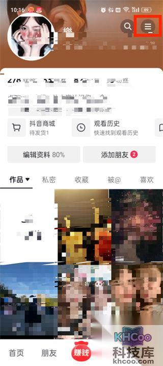 2、然后在我的页面中可以看到自己的作品、点赞、收藏等内容,在这里我们需要点击右上角的【三横图标】;