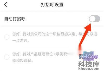 4. 在进入的页面里“自动打招呼”的后面会看到有一个开关按钮,在上面点击后把它设置为开启状态。
