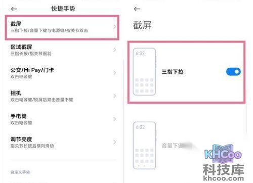 3、首先在设置的“ 快捷手势 ”中找到截屏选择,打开“ 三指下拉 ”功能。