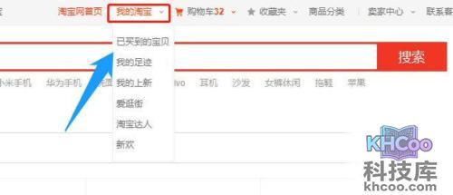 2、然后顶部选择 我的淘宝 ,找到 已买到的宝贝 。