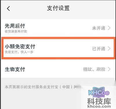 在支付功能的页面中,用户可以看到关于小额免密支付功能的选项,点击进入功能详情。