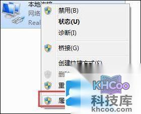 2、在打开的窗口中右击“本地连接”图标,选择弹出菜单中的“属性”命令: