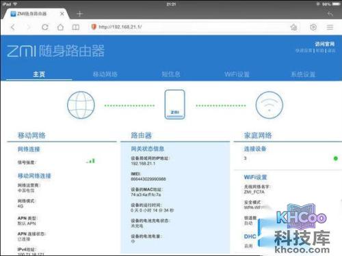 如果是台式机、笔记本可以在浏览器从192.168.21.1访问路由器后台,密码还是zimifi。
