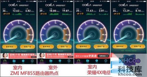 测试结果,ZMI MF855路由热点,在室内的下载和上传分别是12.62Mbps、6.82Mbps,PING延迟36ms;室外的下载和上传分别是18.80Mbps、19.87Mbps,PING延迟39ms。荣耀4X电信版Wi-Fi热点,室内的下载11.43Mbps,上传2.81Mbps,PING延迟25ms;室外的下载13.29Mbps,上传8.18Mbps,PING延迟24ms。