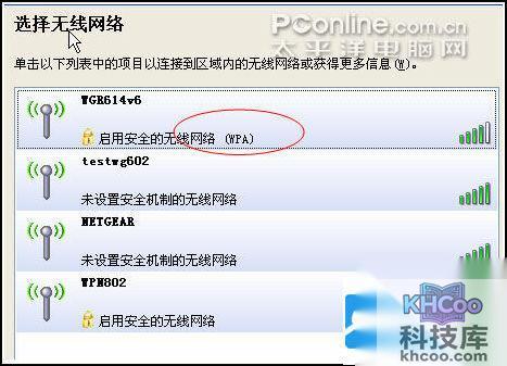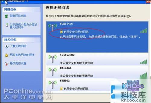 发现SSID为WGR614v6的无线网,但是起用了安全机制,双击该无线网络,或者连接: