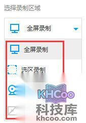 用户可以选择的 录制区域 有全屏录制、选区录制、只录摄像头和不录视频选项。