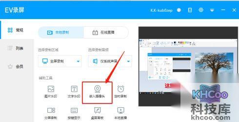 1、打开ev录屏软件,在常规中找到 辅助工具 区域,点击嵌入摄像头。